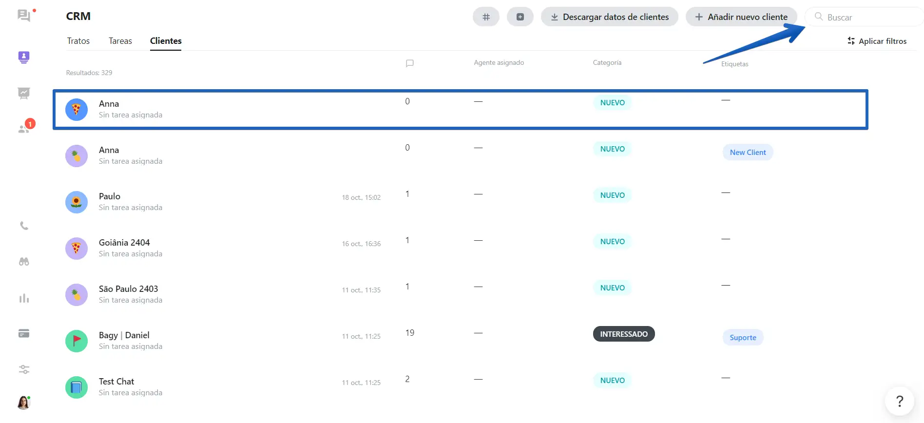 En la pestaña Clientes, encontrará la lista de clientes con los que ha hablado a través de JivoChat. Tendrá acceso al historial completo de conversaciones con cada cliente y algunos datos estadísticos como el número total de conversaciones, el agente asignado, el estado y las etiquetas agregadas a cada uno de ellos.