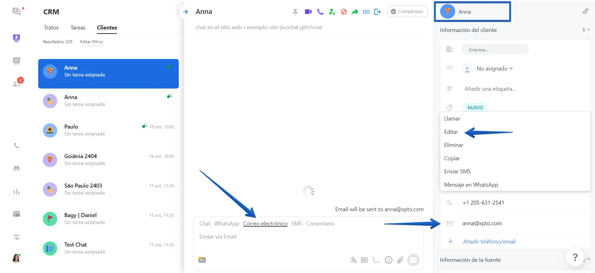 Puede editar los datos del cliente en la misma conversación. Para hacerlo, vaya al chat y haga clic en la parte superior en el nombre del cliente para editarlo. Al hacer clic en el email del cliente o el número, verá una lista de opciones, podrá editar o realizar otra acción con la información de contacto del cliente.