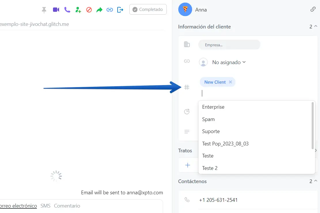 Para añadir una nueva etiqueta, solo debe hacer clic en el campo de etiqueta en el panel izquierdo del chat y añadir la etiqueta deseada, también puede eliminarla del sistema. Si ya no necesita una etiqueta específica, puede eliminarla completamente del sistema en Ajustes -> Configurar CRM -> Etiquetas