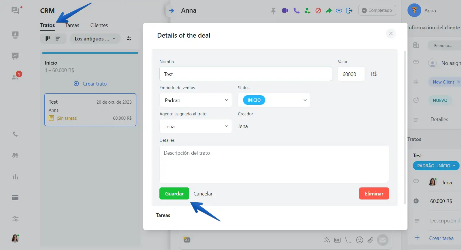 En la pestaña "Tratos", puedes crear transacciones con cualquier cliente que desees y establecer un embudo de ventas para dar seguimiento a cada uno de ellos con el tiempo. Dentro de cada transacción, introducirás información como el Nombre, Valor, a qué embudo pertenece este cliente, el estado del cliente, el operador responsable de la transacción específica y, finalmente, un comentario.