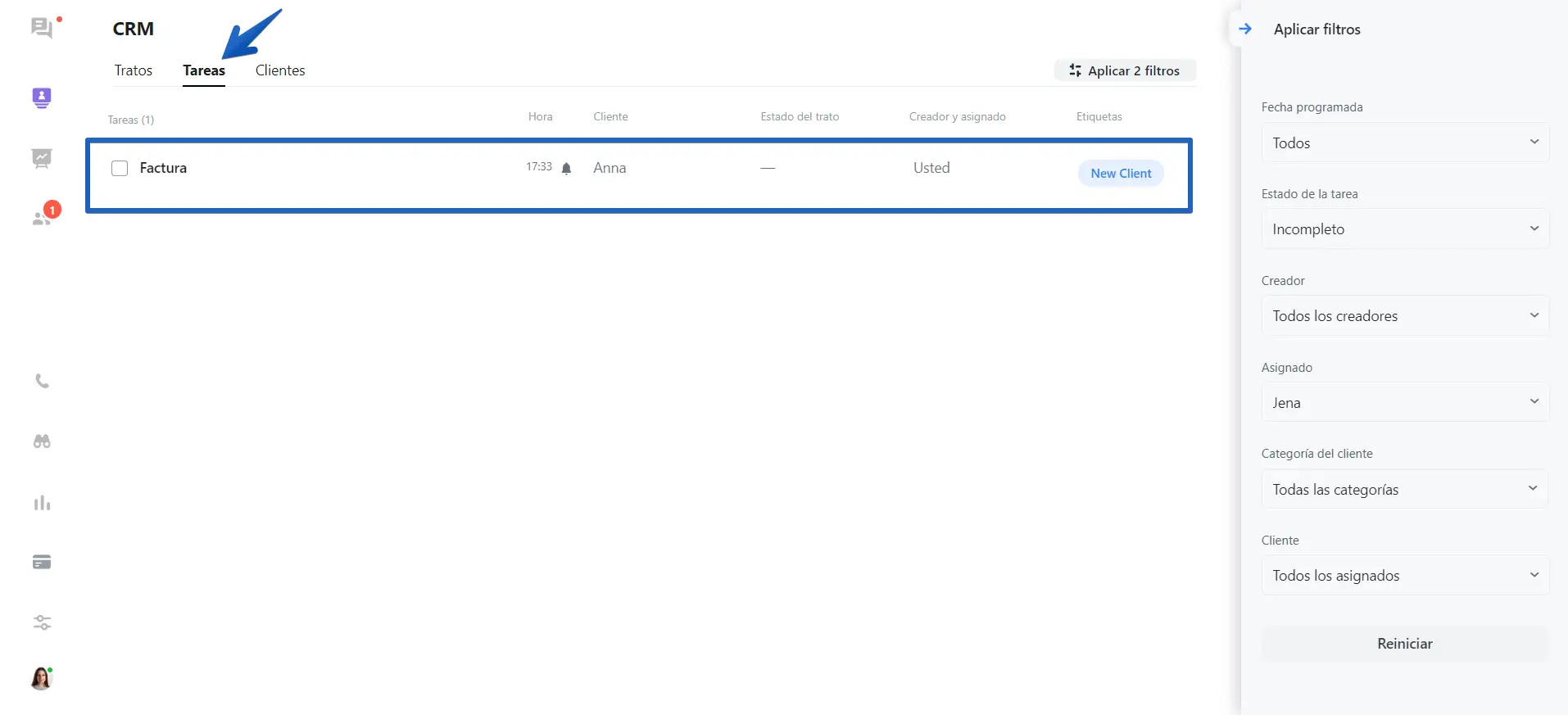 En la pestaña "Tareas", tendrás acceso a todas las tareas creadas dentro de cada conversación con cada cliente.