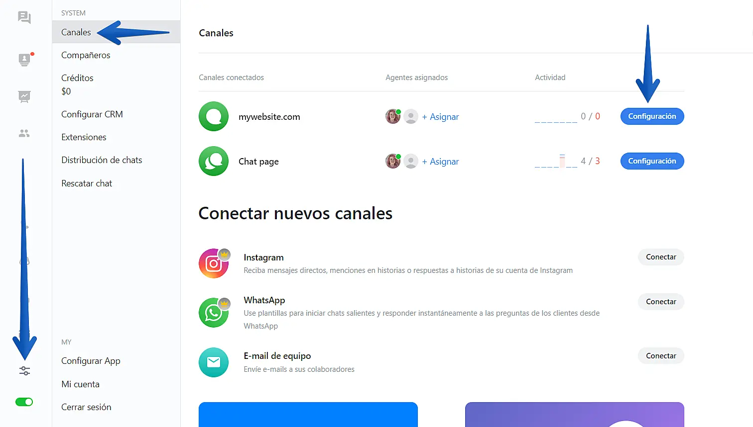 2. Vaya a "Ajustes"->"canales" y haga clic en las configuración justo al lado del nombre del canal.