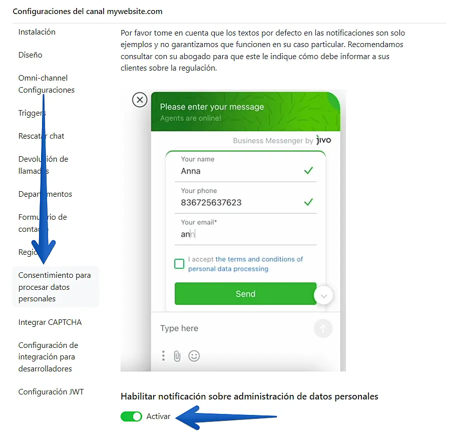 Activar notificación de consentimiento de uso de datos personales