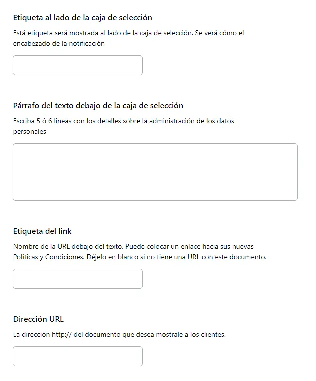 NOTA Puede dejar los campos en blanco si no tiene un enlace a sus términos de uso.
