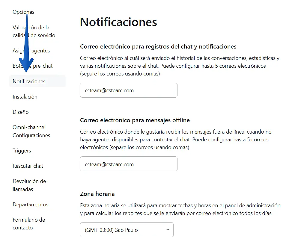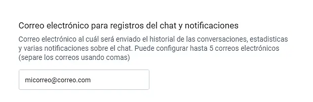 Si desea cambiar las notificaciones(es decir. la dirección de correo electrónico a la cual los registros de chat en línea y cuando esté desconectado serán enviados) los mensajes serán enviados a: