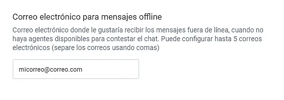 - Correo electrónico para mensajes sin conexión- Esta dirección se utilizará para los mensajes enviados por los visitantes de su sitio web cuando sus agentes no están disponibles para chatear (es decir, cuando estén fuera de línea o en modo ausente)