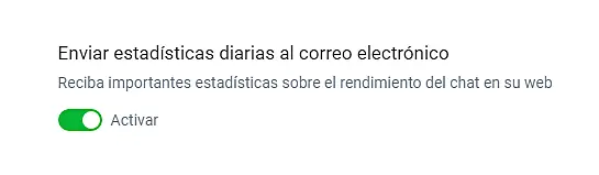 Si desea desactivar las notificaciones o los mensajes offline, puede dejar estos campos en blanco y guardar la configuración. Nuestro servicio puede enviar informes diarios a su dirección de correo electrónico con registros del chat. En este informe se encuentran las estadísticas diarias de los chats y los agentes.
