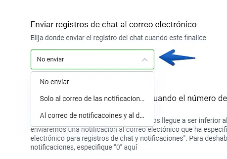 • A la dirección para notificaciones y el agente - si selecciona esta opción, los registros de chat se enviarán al correo electrónico del agente y a la dirección para las notificaciones.
