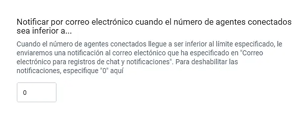 Si usted es un administrador y desea supervisar a sus agentes en línea, puede configurar las notificaciones que se enviarán a su correo electrónico si el número de agentes en línea es menor al número que usted defina.