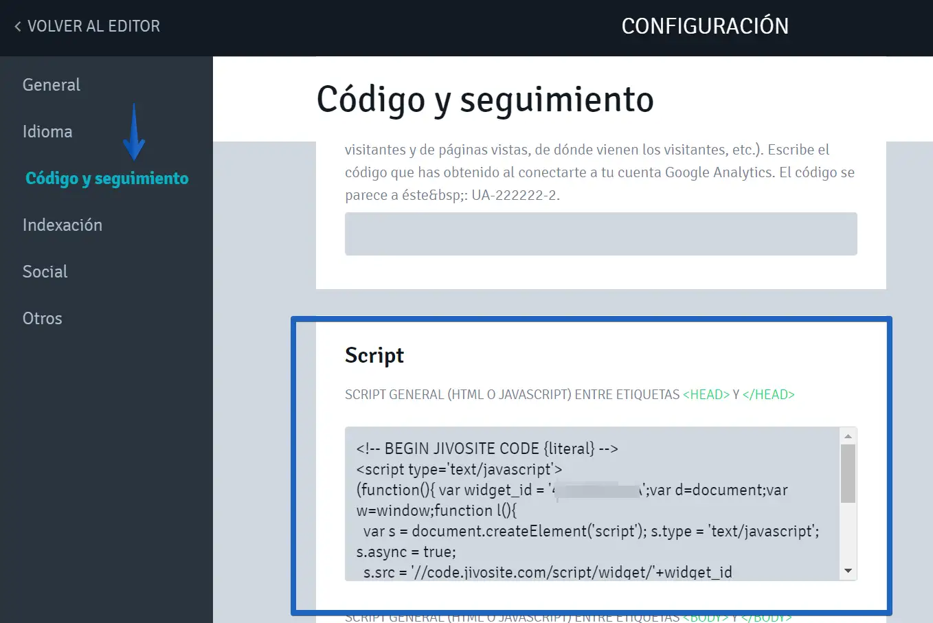 En el siguiente menú haga clic en "Código y seguimiento" y pegue el código en la pantalla "script" entre /// y /// como se indica en la siguiente imagen: