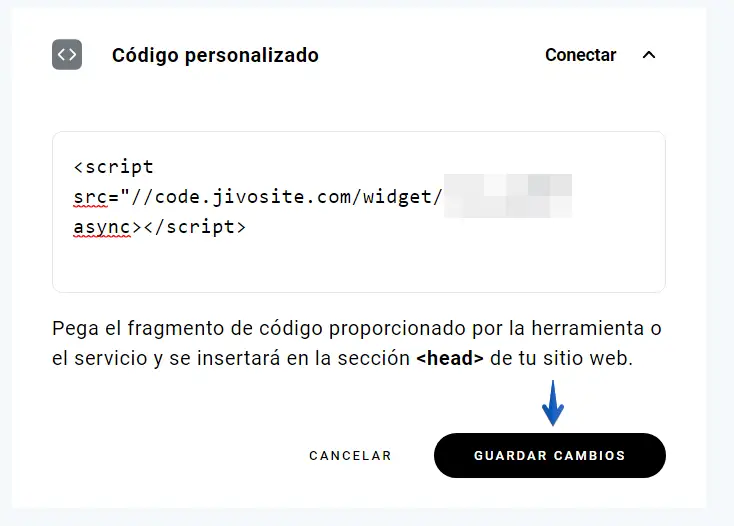 En la página siguiente, seleccione la opción Integraciones del menú de la izquierda. Luego busque la opción Código personalizado y añada el código de JivoChat en este campo. Para encontrarlo, puede accceder a nuestro tutorial en este link.