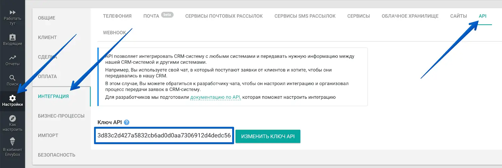 1.Llave API: Inicie sesión en EnvyCRM y en el panel vaya a "Settings > Integration > API". Haga clic en el botón "Get API Key" para poder generar la Llave.