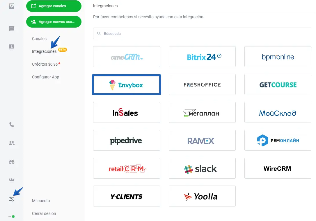Para integrar con EnvyCRM", abra su Aplicación del agente y vaya a "Ajustes"-> "Integraciones" y haga clic en EnvyCRM"