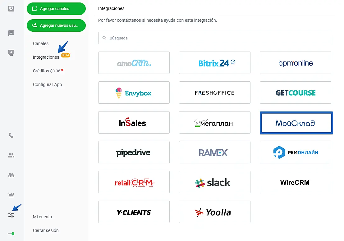 Para integrar con MoySklad CRM, abra su Aplicación del agente y vaya a "Ajustes"-> "Integraciones" y haga clic en MoySklad CRM"