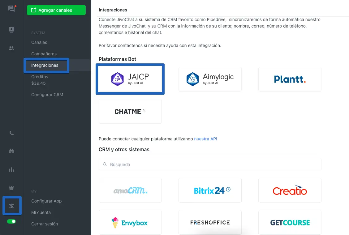 Cuando tenga el token, acceda a la aplicación JivoChat, vaya a Ajustes > Integraciones y seleccione JAICP.