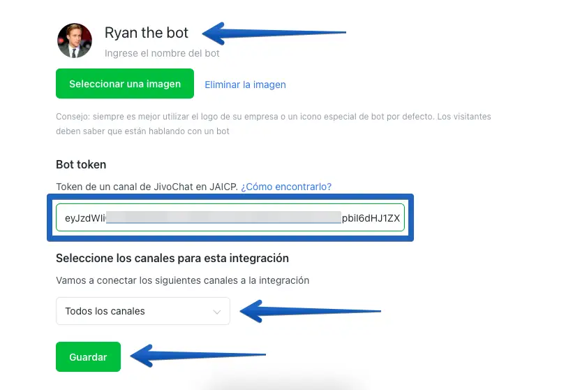 Ingrese el nombre del bot, cargue una imagen y seleccione los canales para los que desea aplicar el bot. Cuando todo esté configurado, haga click en Guardar.