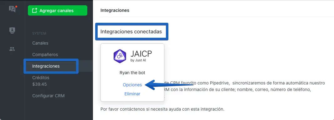 ¡La integración está completa! Verá el bot en Integraciones conectadas y puede cambiar su configuración cuando lo desee colocando el puntero del mouse sobre la integración > Opciones.