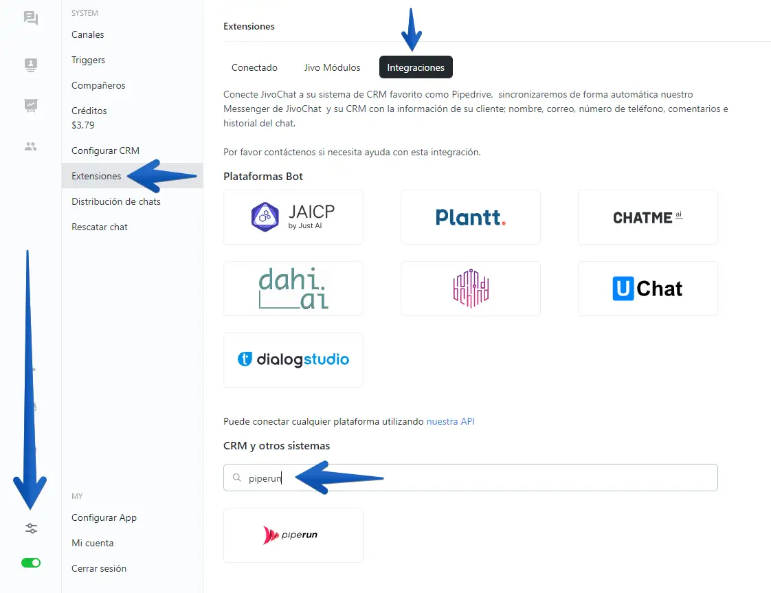 Para integrar PipeRun con JivoChat, abra la aplicación web JivoChat o la aplicación de escritorio, acceda a Ajustes, luego elija Extensiones, seleccione Integraciones y en el campo CRM y otros sistemas, busque PipeRun.