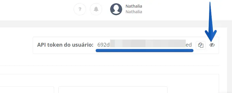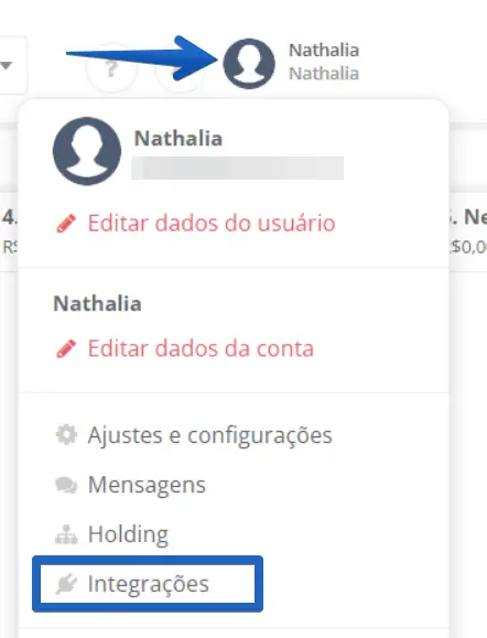 1. Token de Acceso: Para generar un token vaya a su panel de PipeRun, haga clic en la parte superior donde se encuentra su nombre de usuario, se desplegará un menú en el cuál verá "Integraciones" ("Integrações").