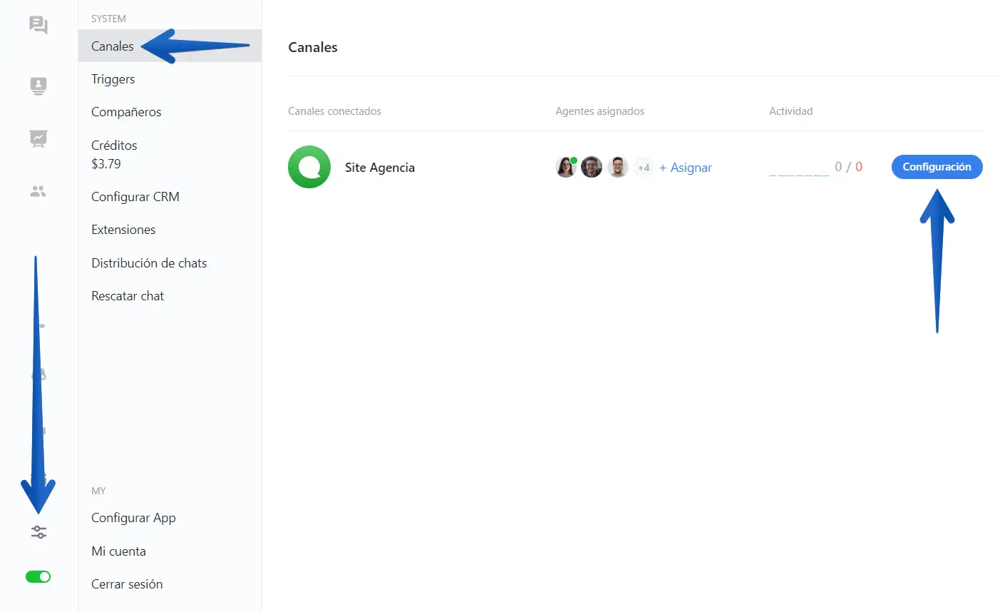 1. Accede a tu aplicación web de JivoChat o a cualquiera de nuestras aplicaciones de escritorio, y haz clic en "Ajustes", luego en "Canales", busca el canal deseado y haz clic en "Configuración":