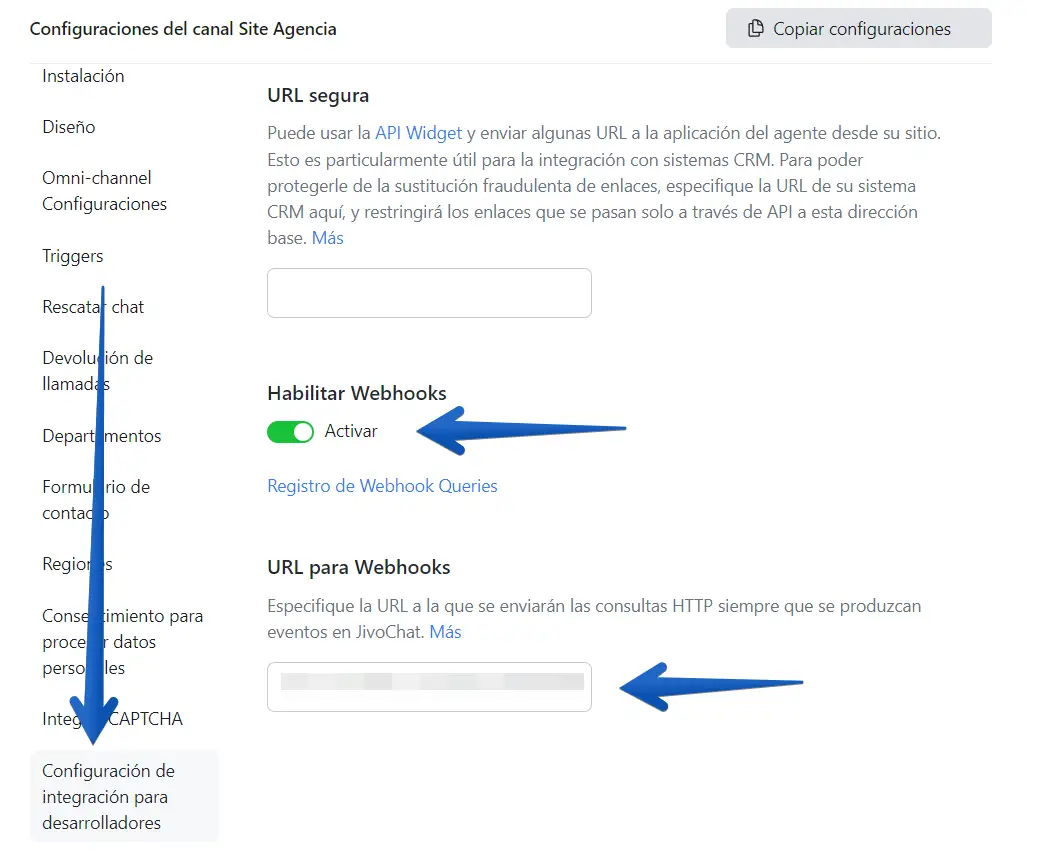 2. En el menú de la izquierda, haz clic en "Configuración de integración para desarrolladores" (1), activa la opción "Habilitar webhooks" (2), y pega la URL generada desde tu panel de PipeRun en el campo "URL para webhooks" (3).