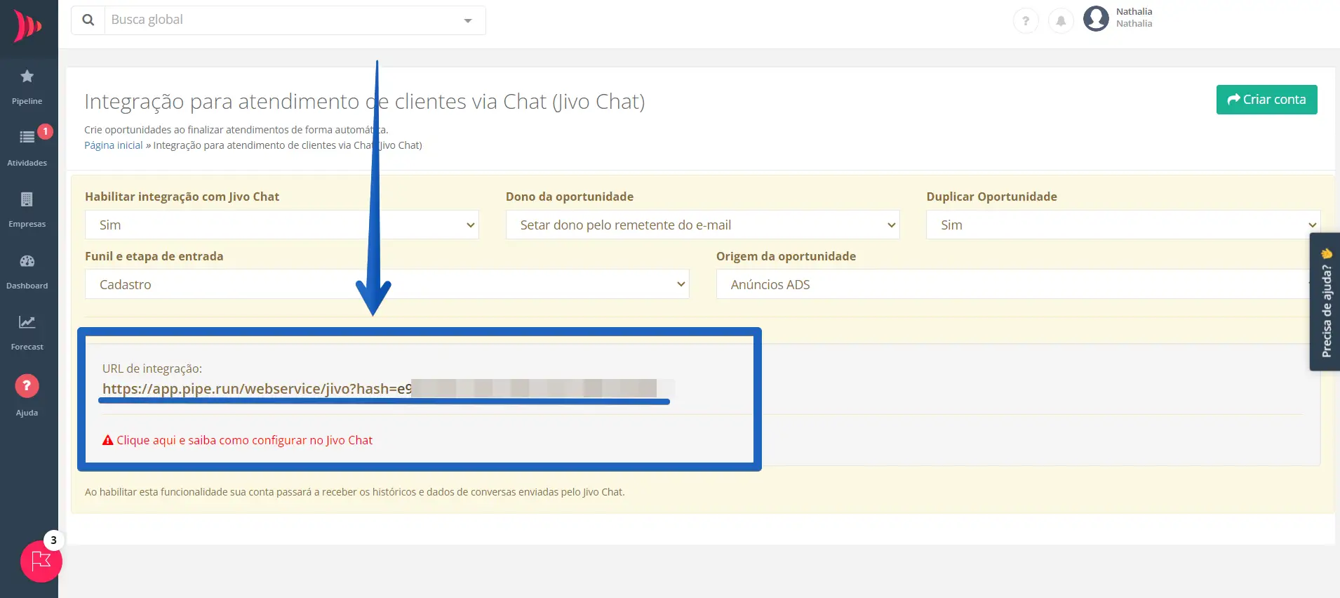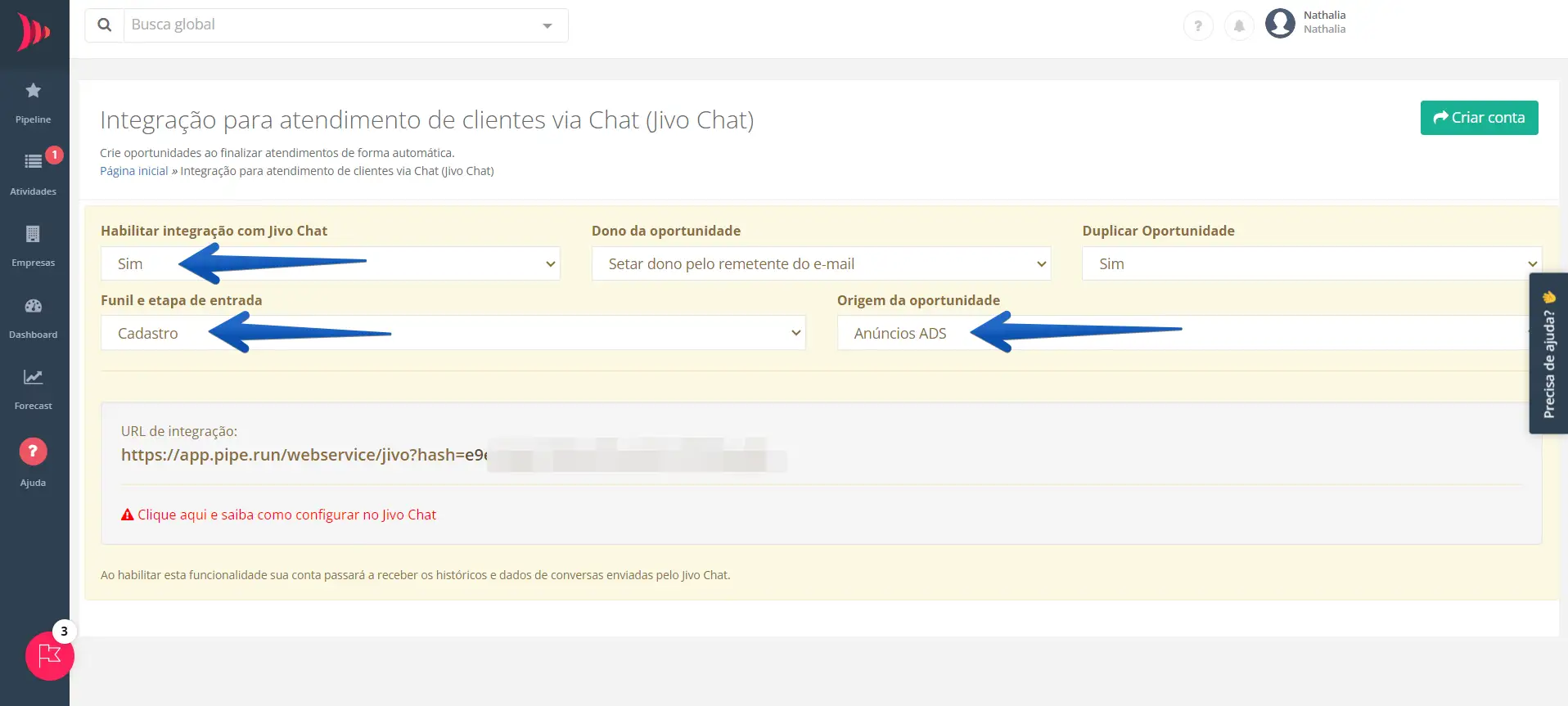 4. En la siguiente pantalla, selecciona "Sim" para habilitar la integración con JivoChat. También puedes seleccionar el propietario de la oportunidad y duplicarlo si así lo deseas. No olvides seleccionar el embudo y la etapa del embudo donde deseas que se registren las oportunidades de negocio generadas en JivoChat. Por último, selecciona el origen del negocio.