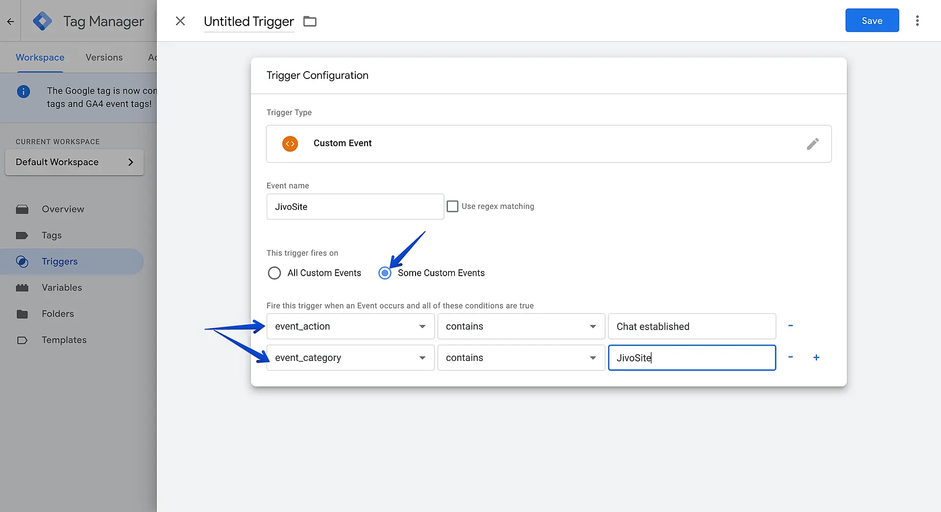 - El tipo de trigger será un evento personalizado o "custom event". El nombre del evento que deberá configurar es "JivoSite". Debajo de esto debe seleccionar la opciones "some custom events" o alguns eventos personalizados.