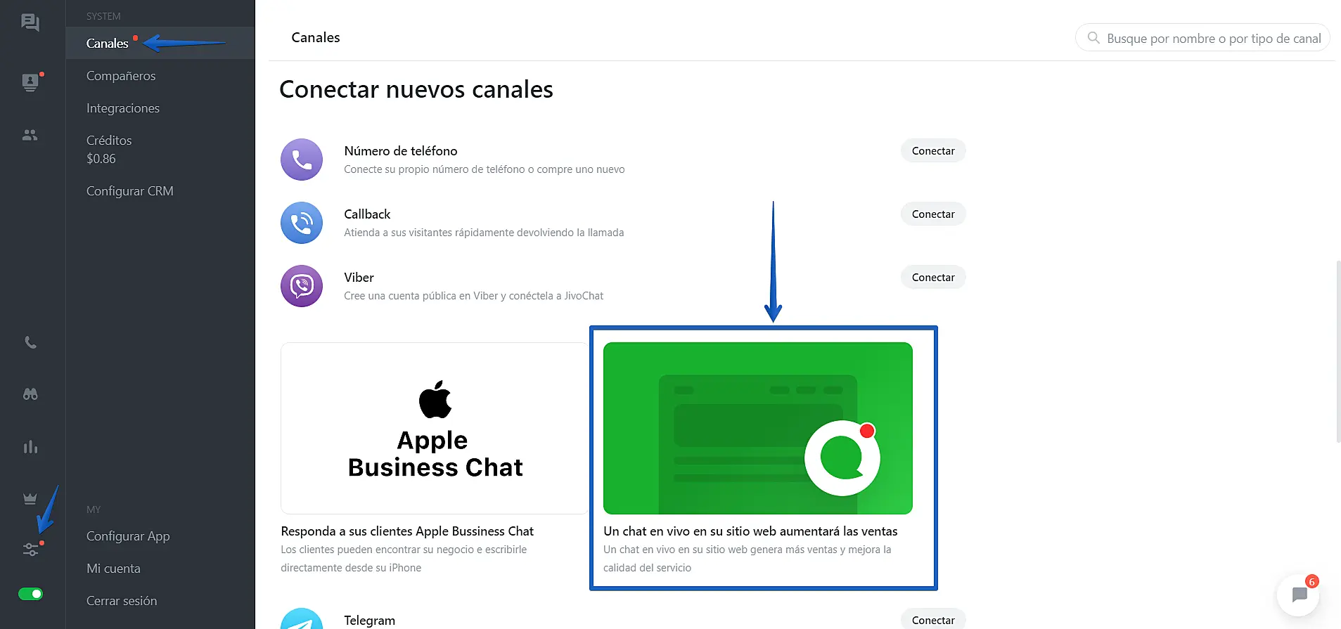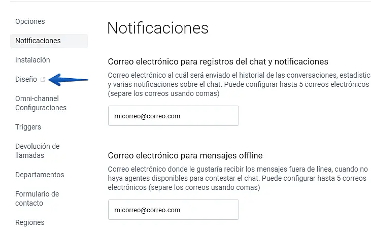 Vaya a los "Ajustes"-> "Canakes"-> "Un chat en su web"