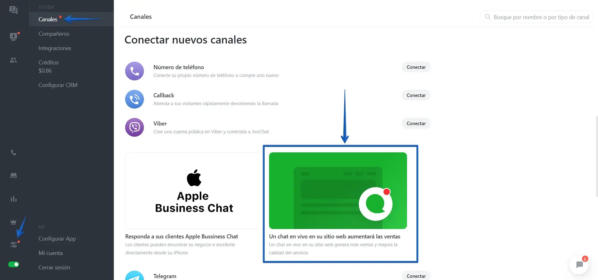 En primer lugar se debe añadir el sitio web en la aplicación instalada o aplicación web de jivo