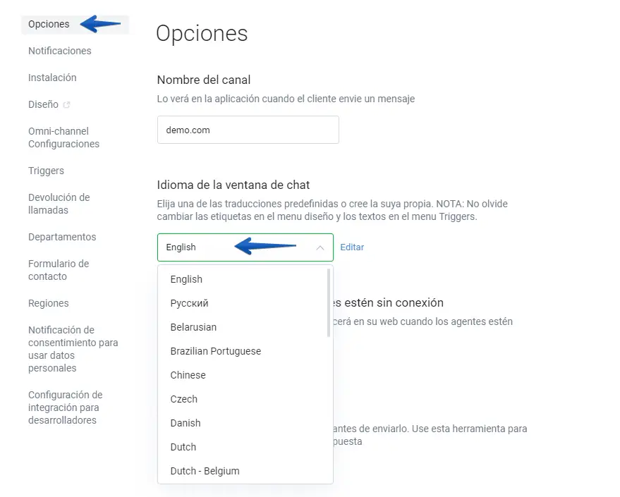 A continuación, debe cambiar el idioma de la ventana de chat para estos sitios web de acuerdo con el idioma del canal.