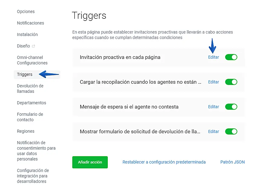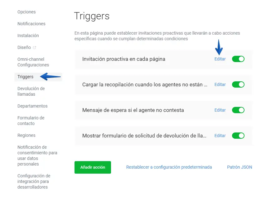 2. Cambie el texto en los "triggers". Vaya a los "Triggers" y "editar". Recuerde editar cada uno: