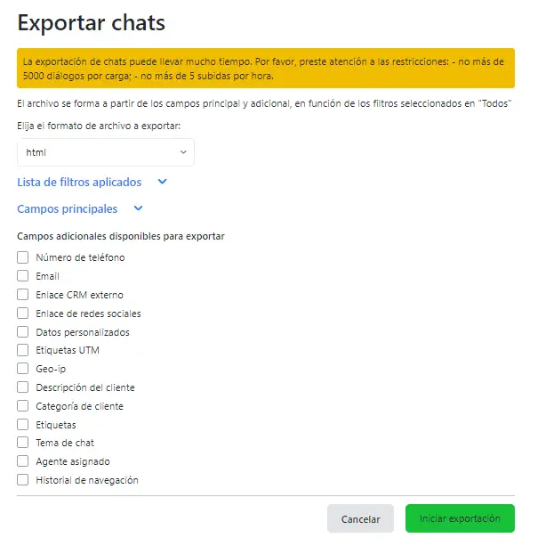 - Campos que quiere ver en el archivo de chats (los campos principales están disponibles por defecto [ID de cliente, nombre de cliente, canal de comunicación, enlace al cliente, número de peticiones, fecha de inicio del chat, velocidad de respuesta, duración del chat, valoración, comentario sobre la valoración, enlace al chat], también puede seleccionar campos adicionales)