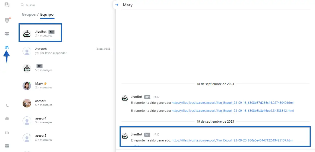 La formación del archivo toma tiempo, el archivo estará disponible en la sección "Equipo" en el chat con JivoBot (sólo espere la notificación)