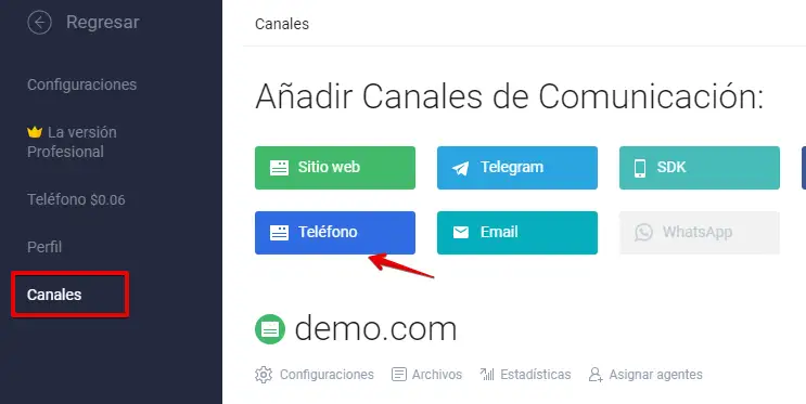 1.Abra la aplicación del agente y vaya a "ajustes", luego "canales" y haga clic en el botón azul que dice Teléfono.