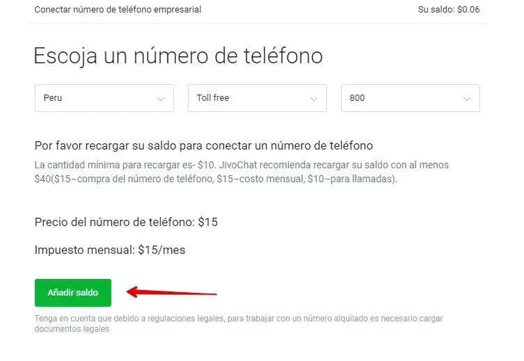 3. Elija el país, tipo de número y cuidad (Si es Toll-free o 0800 no aparece ciudad al igual que en la captura). Luego haga clic en "conectar" o "añadir saldo" (cuando sale añadir saldo es porque no cuenta con el dinero suficiente para comprar) Por favor tenga en cuenta que dependiendo del tipo de número seleccionado varia el costo, por ejemplo, el Toll-free siempre será más costoso.