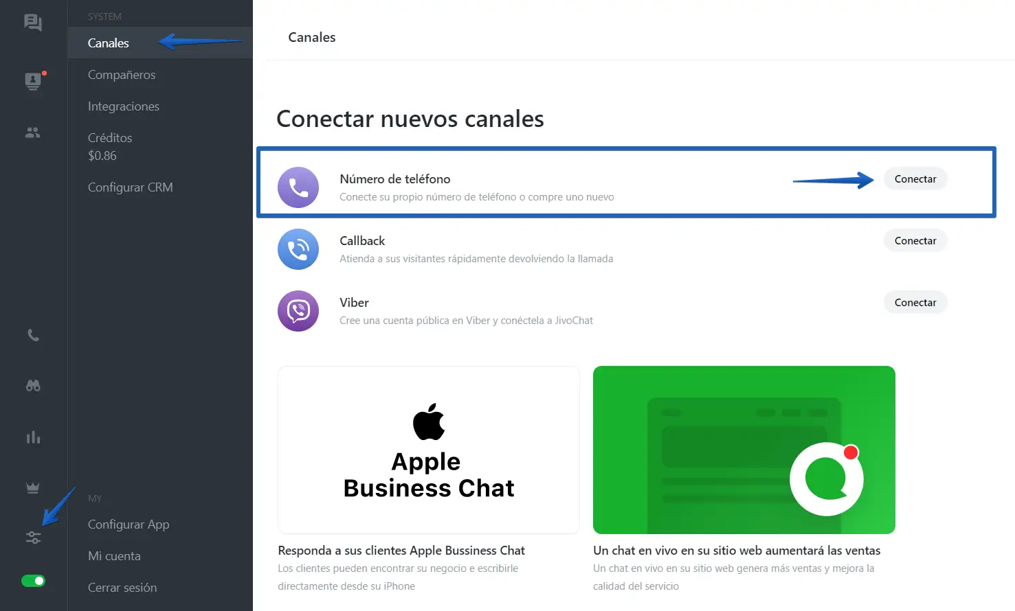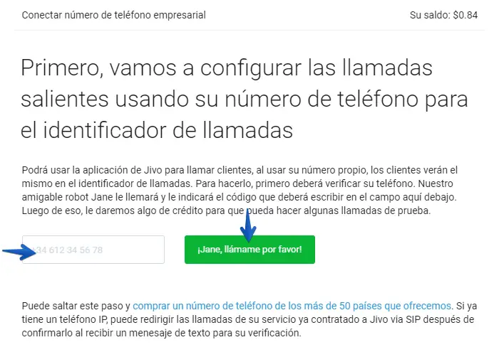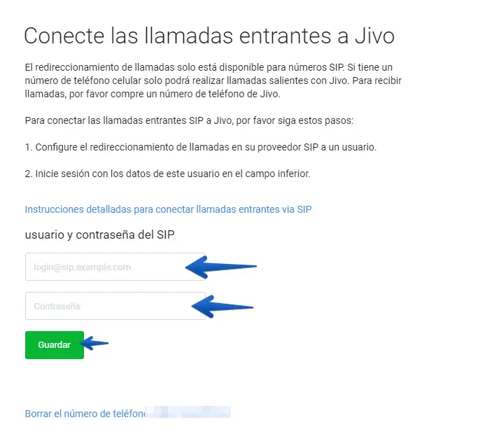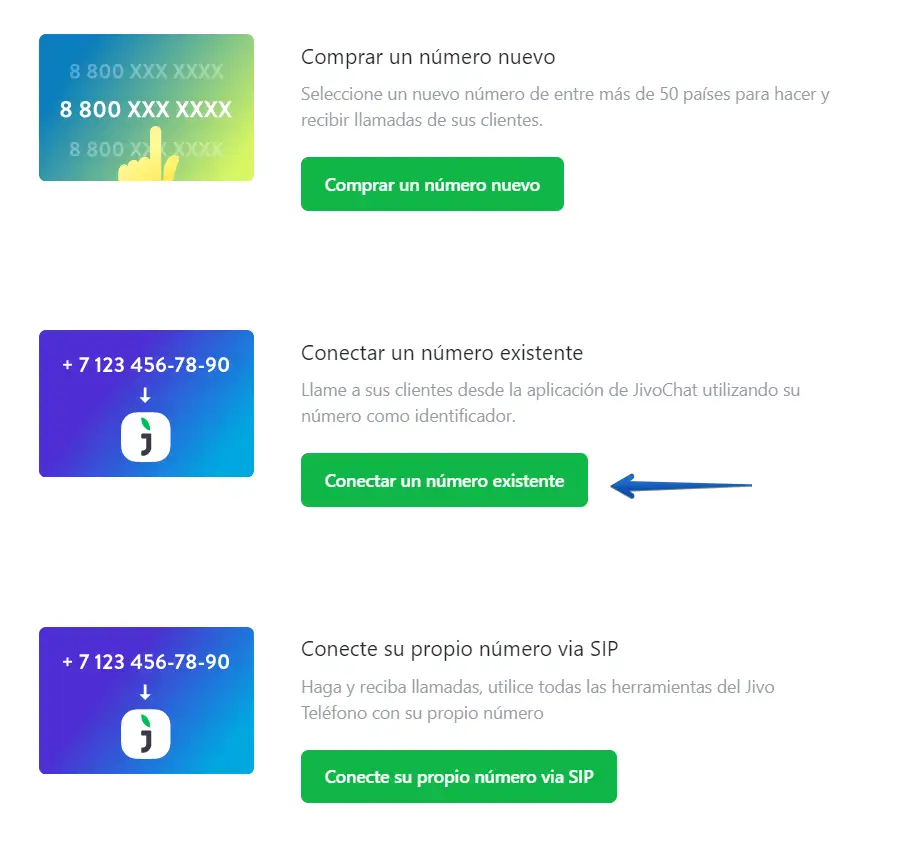 IMPORTANTE: Si conecta un número de teléfono, solo podrá hacer llamadas salientes. Para recibir llamadas usando JivoChat, será necesario que conecte un número SIP de su propiedad o que compre un número de JivoChat.